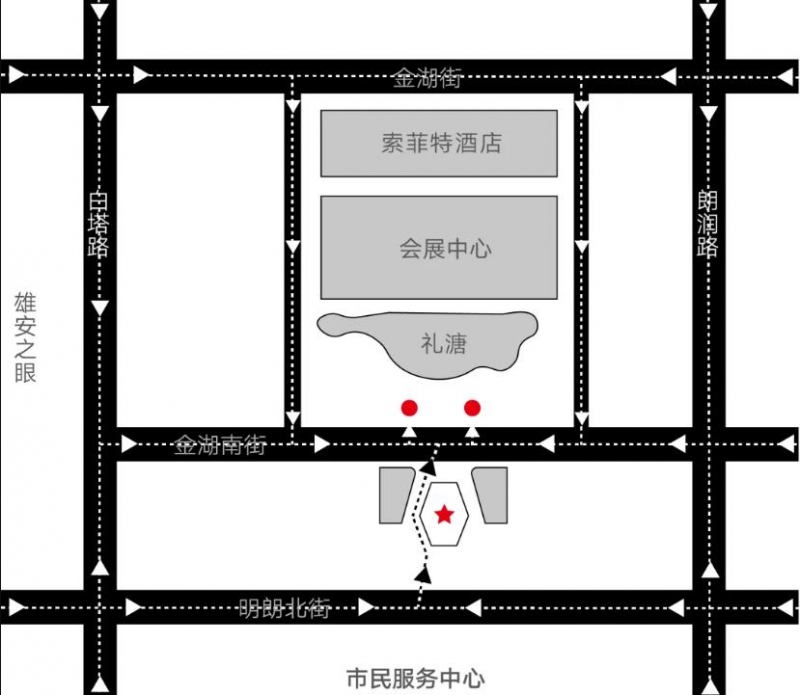 从雄安商服中心南广场进入,从地上礼溏两侧下行至展览开幕主会场 时光艺术空间(B1层)