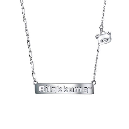 轻松小熊™铂金项链 纯心祈福,「签」引快乐,好运祝福加载中!愿给佩戴者添加欧气值。以印刻“Rilakkuma”品牌字母的卷标牌为设计,结合CNC工艺提升铂金细节质感,轻松小熊头像点缀单侧链身,将萌趣造型与好运祝福巧妙融合,愿助力佩戴者开启幸运新程,祝愿大家轻松获得人生上上签。轻松小熊邀您以轻盈纯真的姿态,邂逅生活中的每一份小确幸。